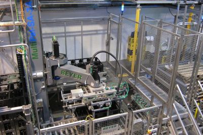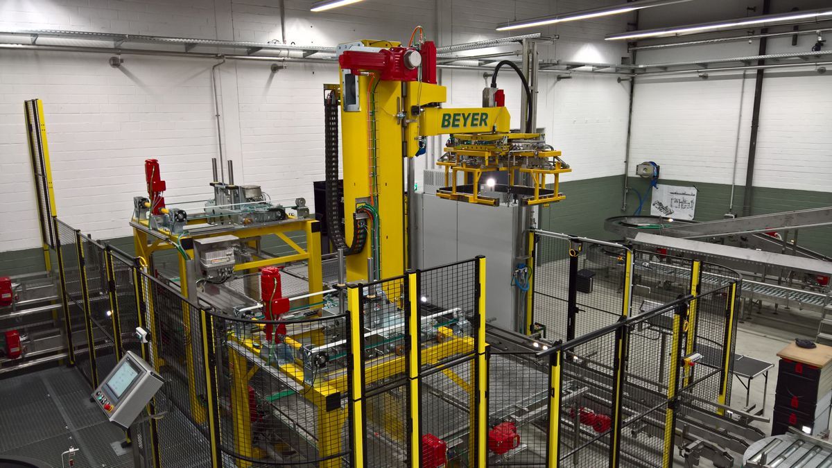 In der kältesten Woche des diesjährigen Winters nahmen die Monteure und Programmierer der Fa. BEYER im Erzgebirge eine neue Palettieranlage in Betrieb, die die bisherigen Kastenstapelgeräte ersetzt. Die auf engstem Raum installierte Anlage ver- und entsorgt die Abfüllanlage, die mit 8.000 Flaschen je Stunde betrieben wird.